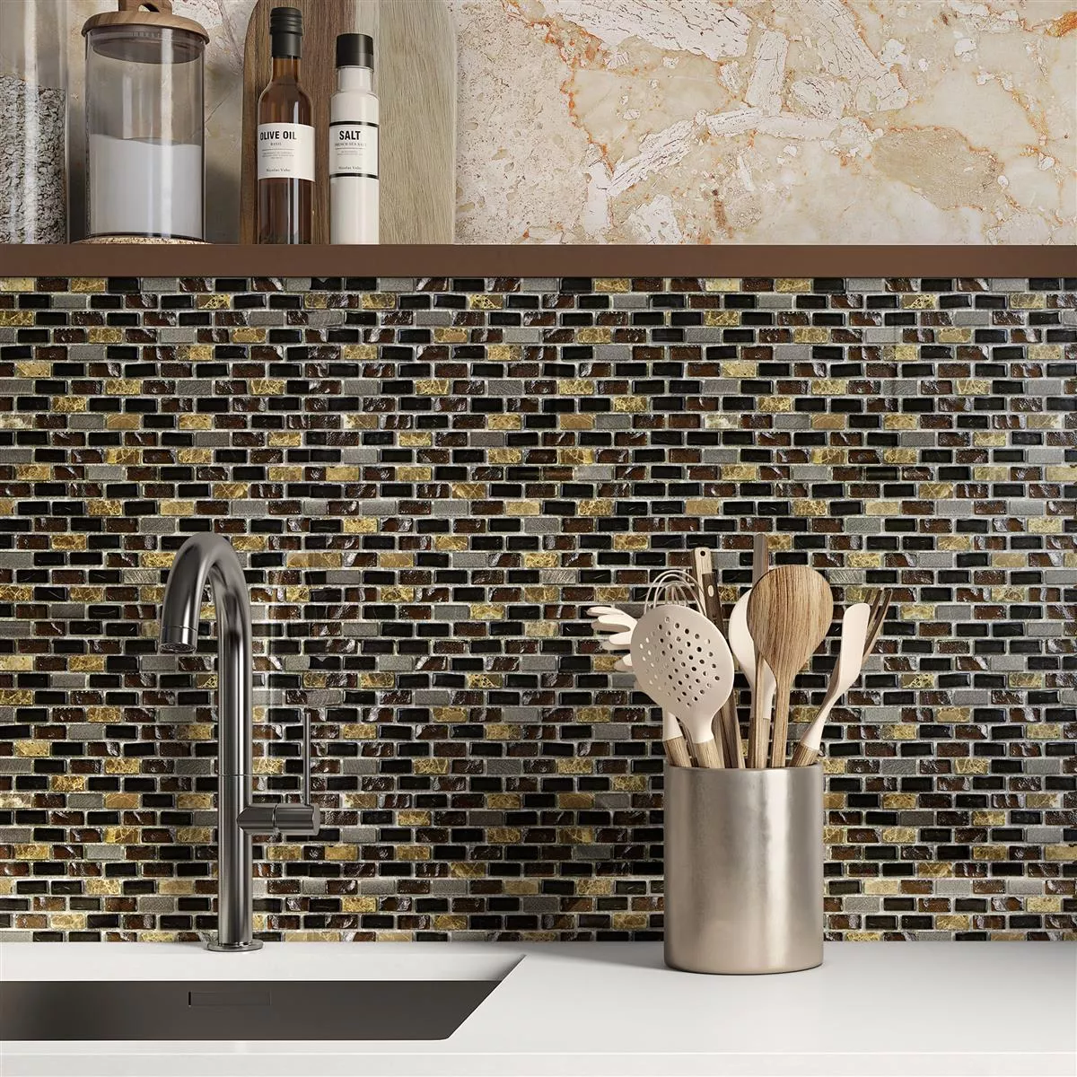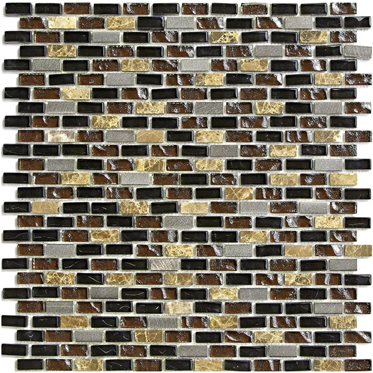 Fordyb dig i den sofistikerede elegance med Glass Marble Aluminium Mosaic Tiles Patterson Brown Mix. Den dristige kombination af sort, sølv og brun, parret med en varieret overflade af mat og blank, skaber et moderne look. Disse mosaikfliser, lavet af aluminium, marmor, metal og glas, tilbyder ikke kun visuel sofistikering, men også en sofistikeret kombination af materialer.