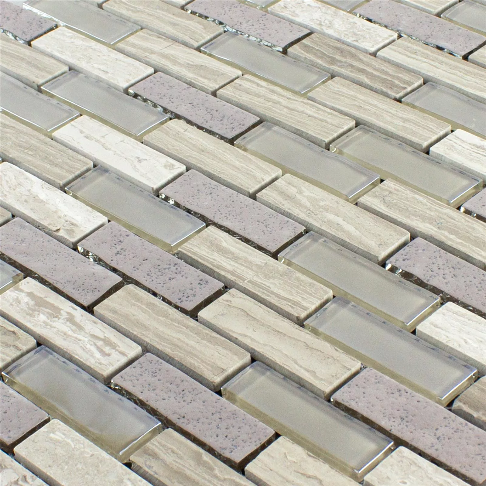 Disse rektangulære mosaikfliser med en størrelse på 29,8x30,4cm og en tykkelse på 5mm er ideelle som vægfliser til badeværelser, køkkener og stuer. Det selvklæbende design gør monteringen nemmere, men det skal bemærkes, at de ikke er egnede til brug i våde områder som brusere eller badekar. Fliserne er lavet af en kombination af natursten og glas og fås i grå. Stenstørrelsen er 15x48mm og overfladen kan være enten mat eller blank.