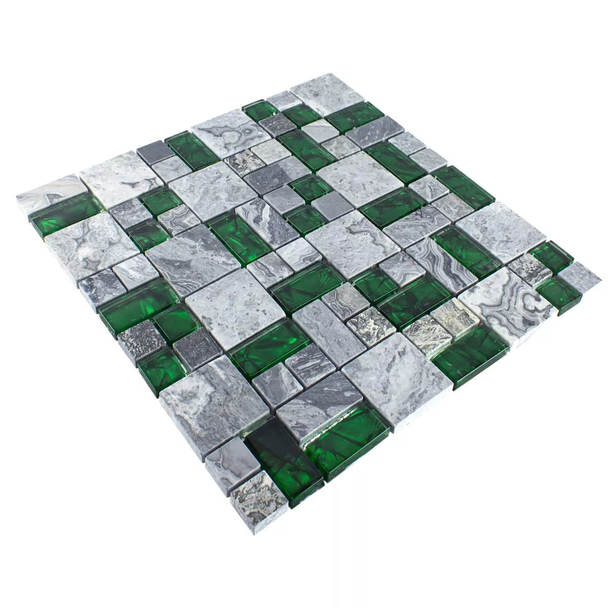 Den grå og grønne mosaikflise kombinerer ædle materialer som natursten, marmor og glas for at skabe et luksuriøst, men funktionelt design til dine værelser. Denne flise er velegnet til både væg- og gulvbelægning og imponerer med sin blanke, polerede overflade, som tilføjer et elegant touch til ethvert rum.