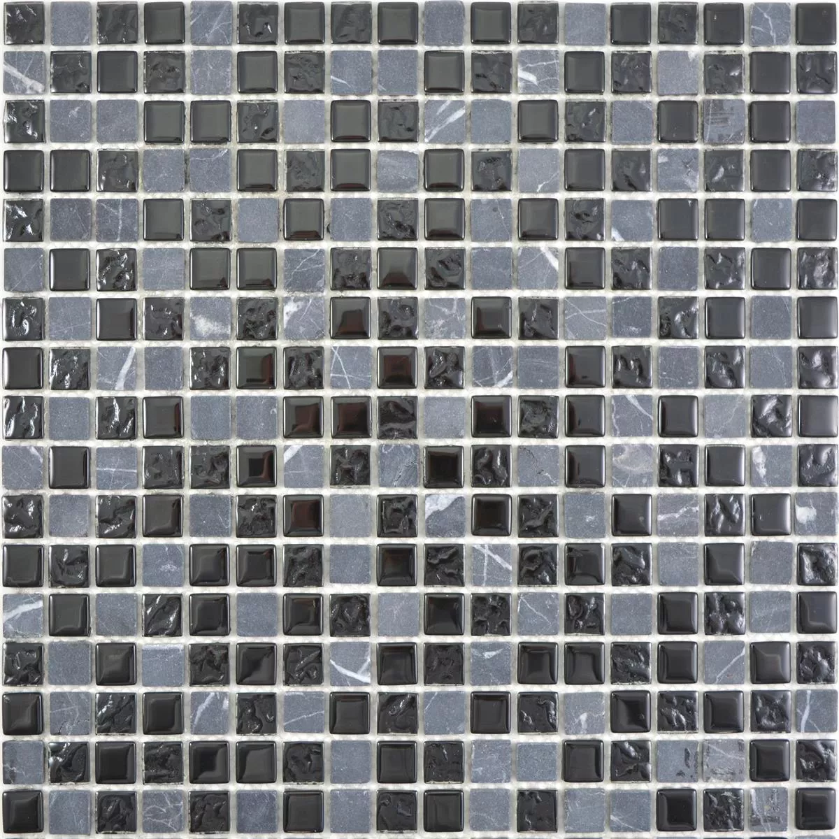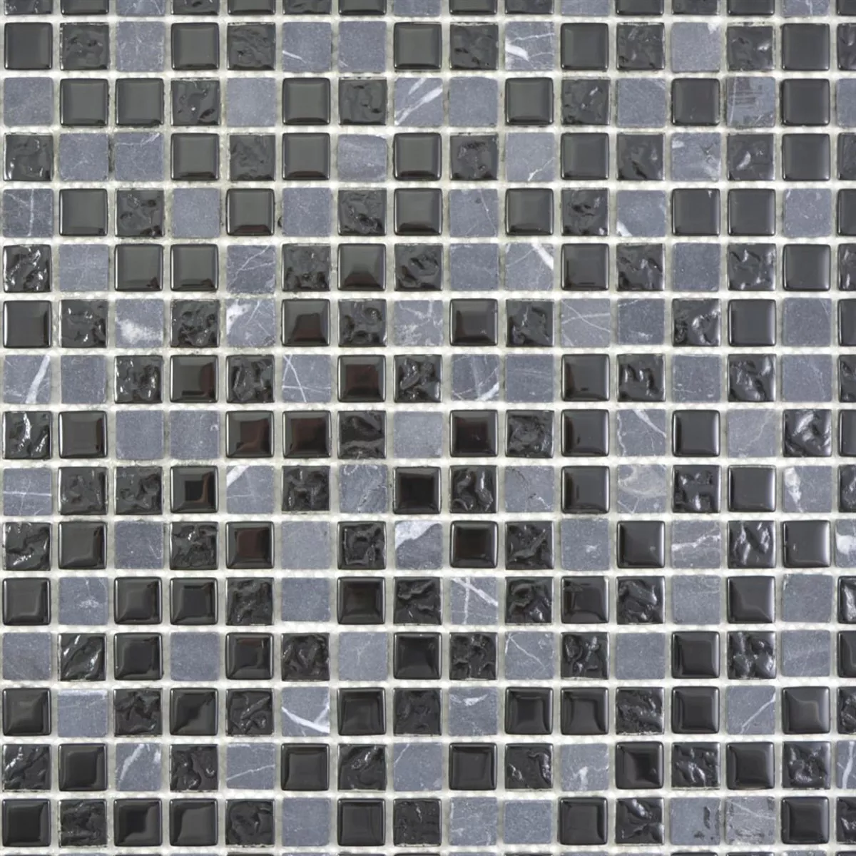 Glas natursten mosaik fliser Zekova i farvevarianten sort grå består skiftevis af marmor og glas. Glas naturstenmosaikflisen Zekova har en stenstørrelse på 15 x 15 mm. Ydermere har stenene skiftevis en mat og blank overflade.