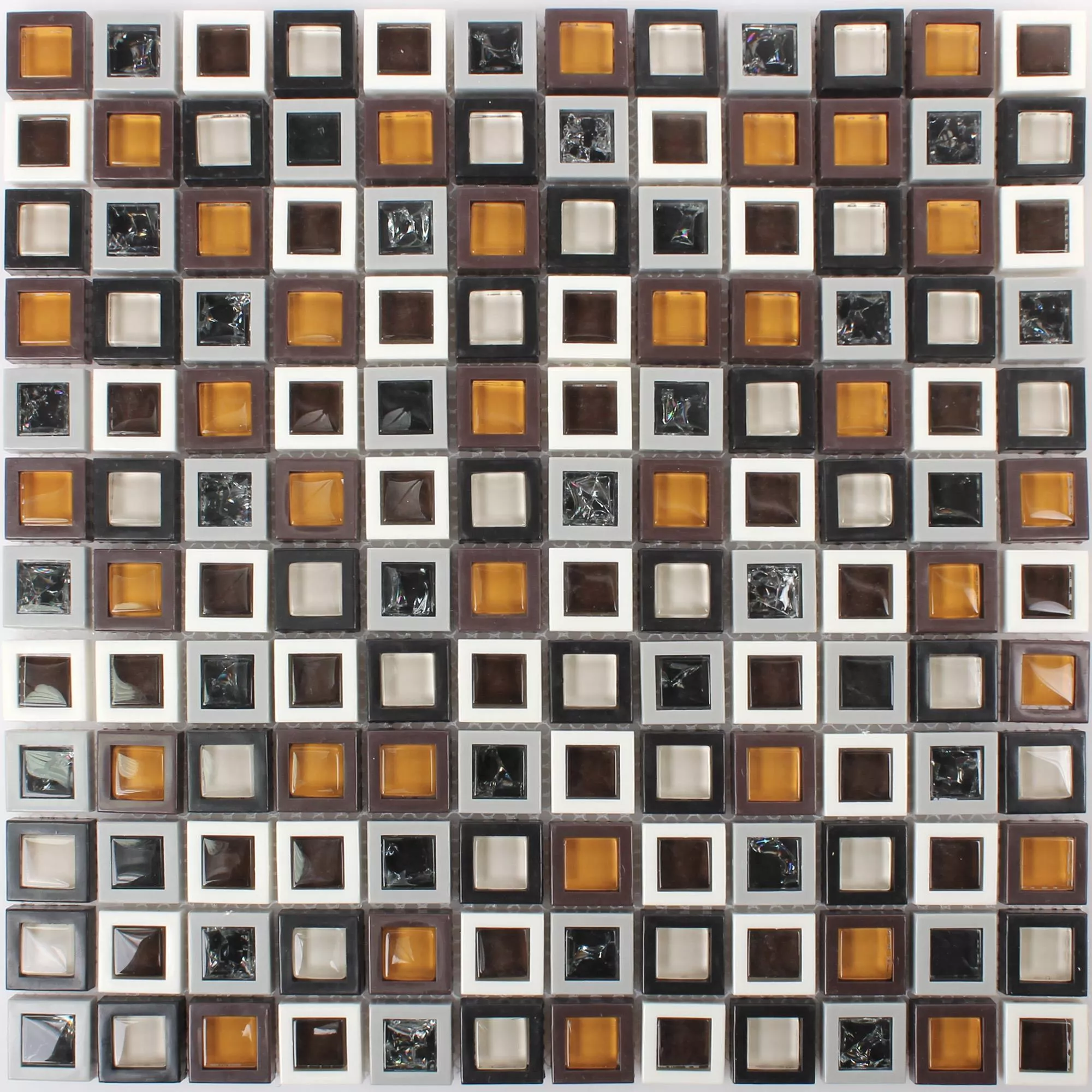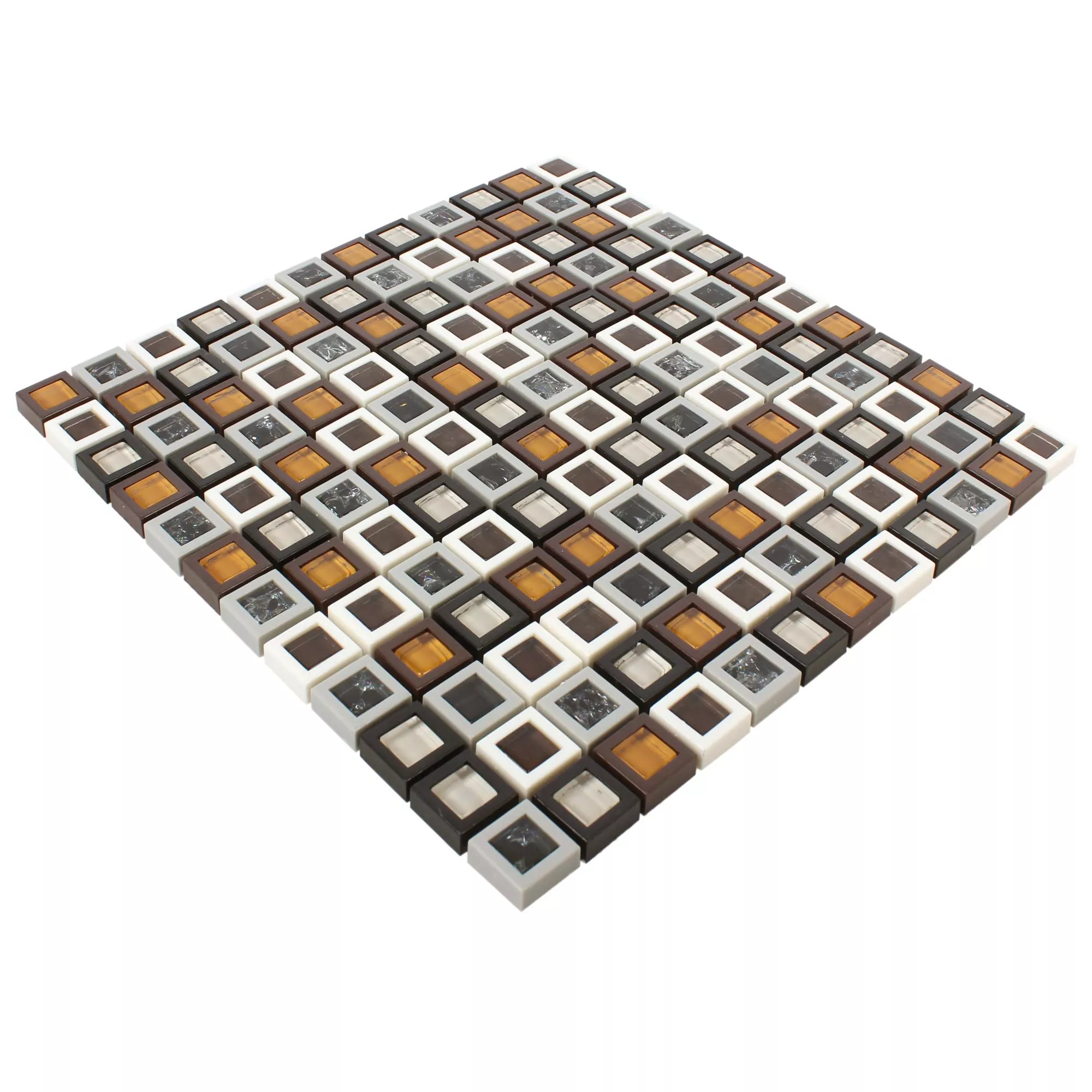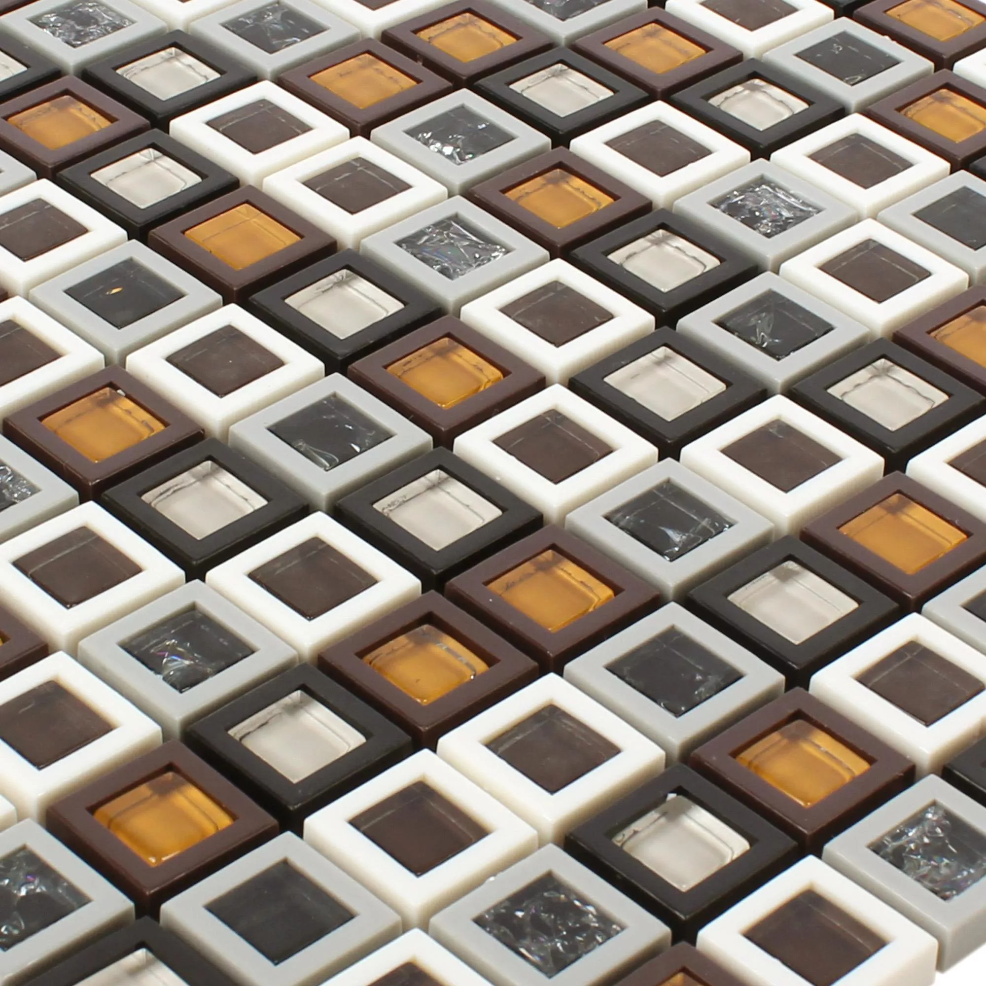 Mosaikfliserne i den grøn-hvide pakke kombinerer lys hvid med accenter i forskellige grønne nuancer, hvoraf nogle tenderer mod blålige. I den anden lyse variant sætter hvidt, mørkt og gulbrunt glas farve highlights. De enkelte vægfliser er hver omkranset af en hvid ramme.