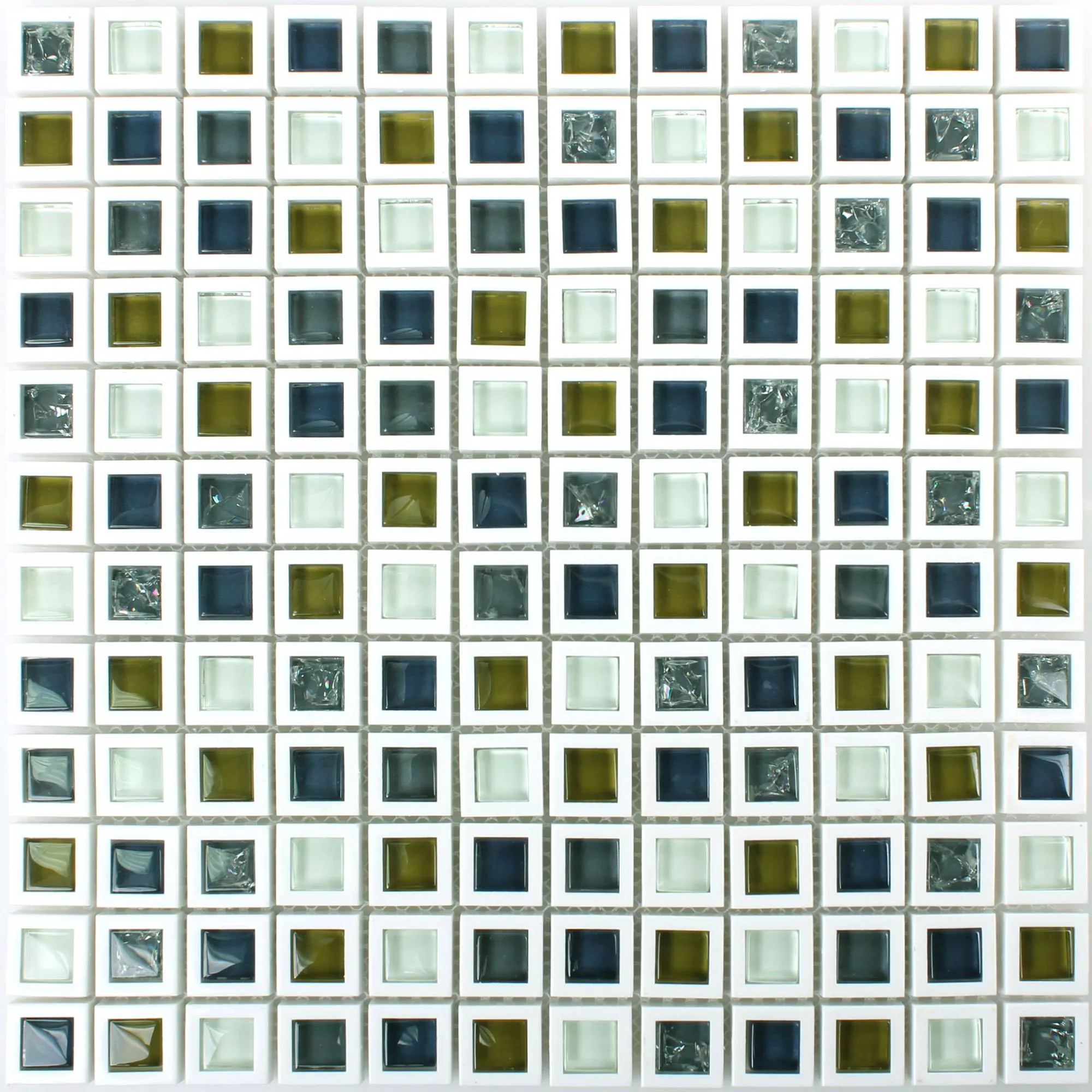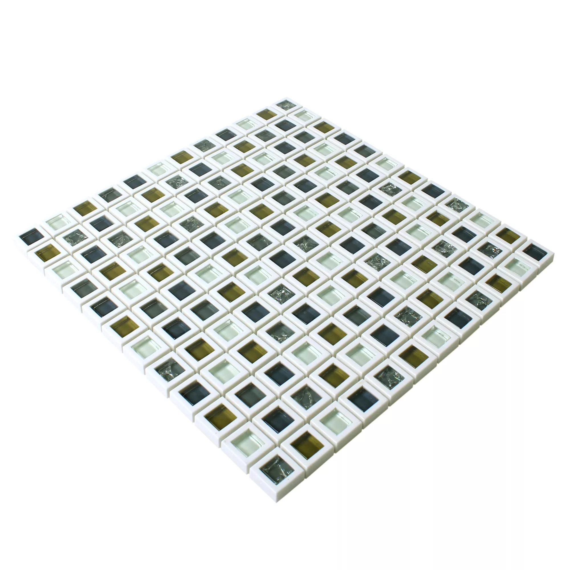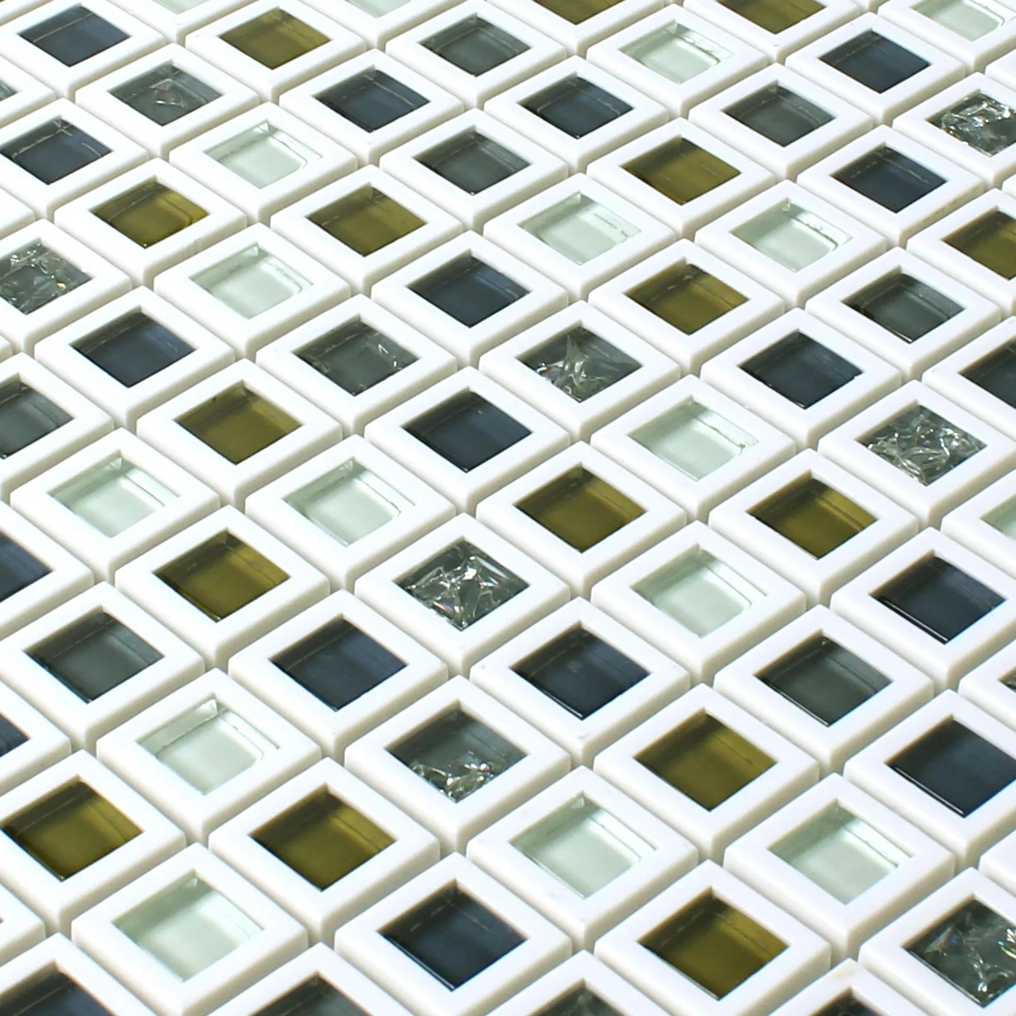 Mosaikfliserne i den grøn-hvide pakke kombinerer lys hvid med accenter i forskellige grønne nuancer, hvoraf nogle tenderer mod blålige. I den anden lyse variant sætter hvidt, mørkt og gulbrunt glas farve highlights. De enkelte vægfliser er hver omkranset af en hvid ramme.