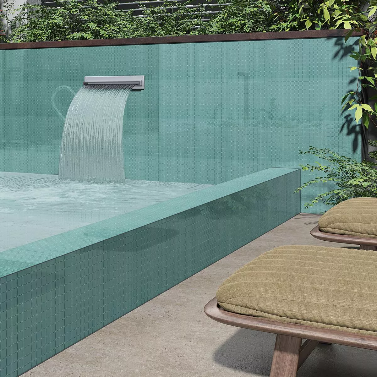 Venetia Pool Mosaic i farven grøn-blå er en højkvalitets mosaikflise, der leveres på en måtte på 0,10 m². Den er ideel til lægning på vægge og gulve og byder på et elegant udtryk takket være sit kvadratiske format med en stenstørrelse på 25 x 25 mm og en flisemåtte på 31,6 x 31,6 cm. Tykkelsen af flisen er 4 mm.