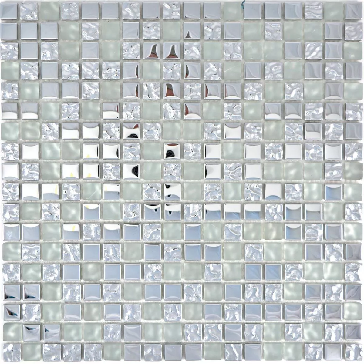 The glass mosaic tiles Tolstoi in silver and white are particularly suitable for the kitchen back wall or frame for kitchen splashback or frame for kitchen mirrors.Their silvery glittering leads to particularly interesting effects in the kitchen mirror and they definitely catch the eye of your guests. How to make your otherwise boring kitchen interesting! Some of the silver tiles are smooth and look ordinary, others are dented and bent - or perhaps ceded? The effect is reminiscent of a cobbled square, but in silver instead of stone.