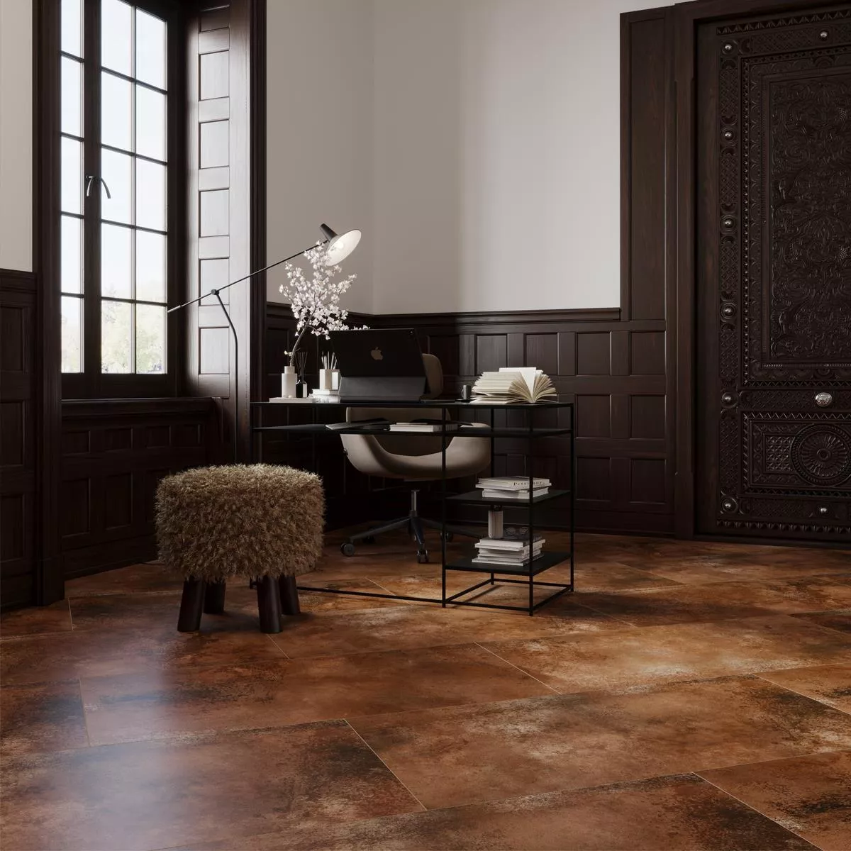 Oregon porcelæns gulvfliser i stentøj kombinerer moderne design med høj funktionalitet. Dens varme brune farve med et metallisk look giver hvert værelse et ædelt og samtidig industrielt præg. Takket være den matglaserede overflade skabes et elegant look, der skaber en stilfuld atmosfære i opholdsrummet såvel som i køkkenet eller badeværelset.