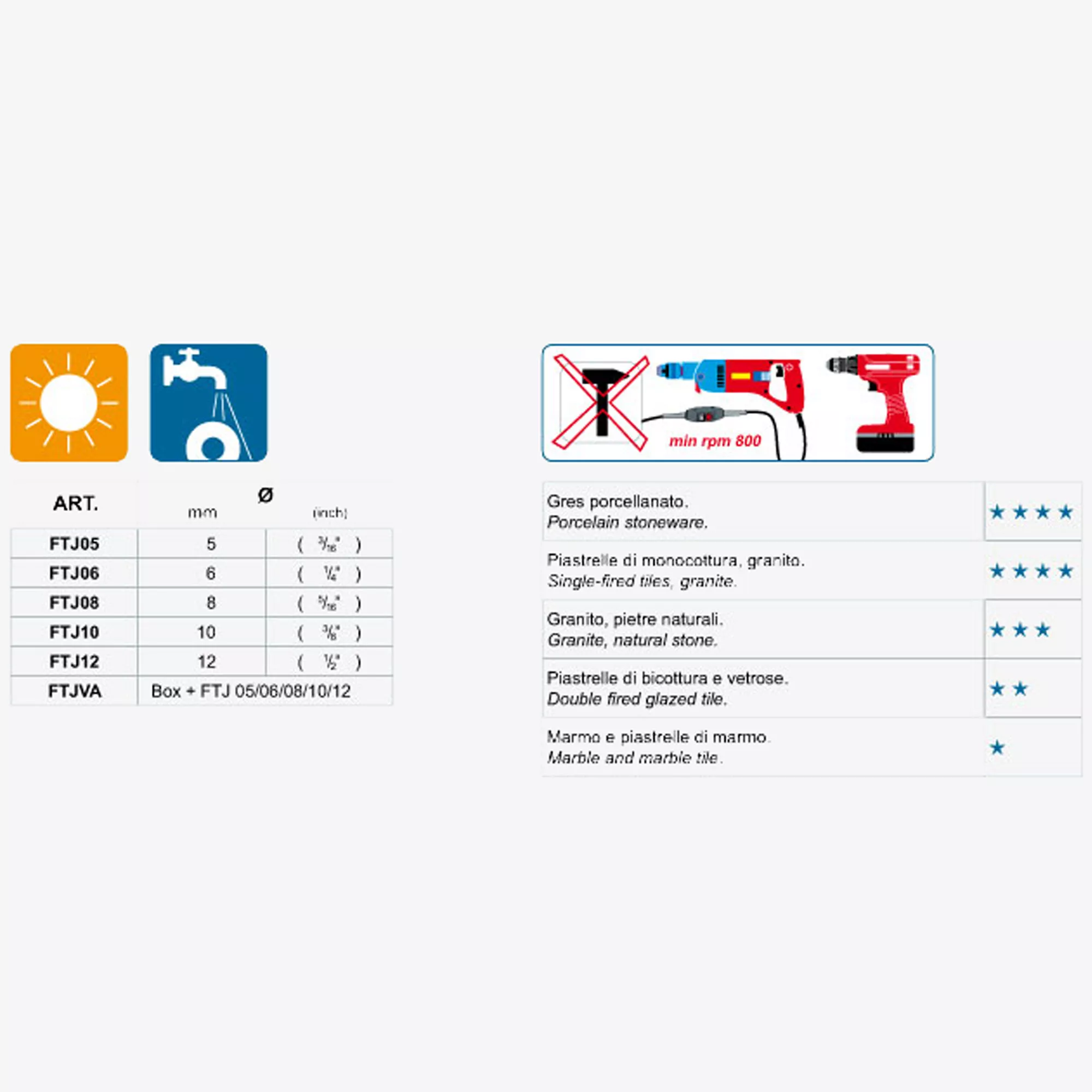 Boret med diamant er velegnet til et bor med 800 omdrejninger i minuttet eller mere. Kronen er ikke anvendelig ved lavere hastigheder. Det sikrer et rent snit og forsøger at forhindre revner i fliserne. Hver størrelse fås individuelt. For at gøre det nemt at skelne fra andre producenter, blev det malet grønt. De enkelte størrelser er 5 mm, 6 mm, 8 mm, 10 mm og 12 mm i diameter. For at opnå det bedste resultat anbefales det at tørre overfladerne af på forhånd. Fliserne kan både bearbejdes individuelt og monteres på væggen. Tilføjelse af lidt vand til boret forhindrer overophedning. Diamanten er langtidsholdbar og kan rigtig godt bruges mange gange.