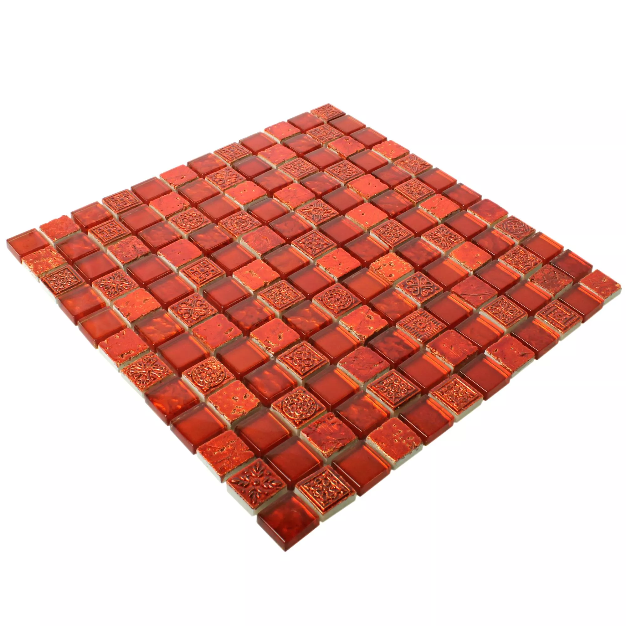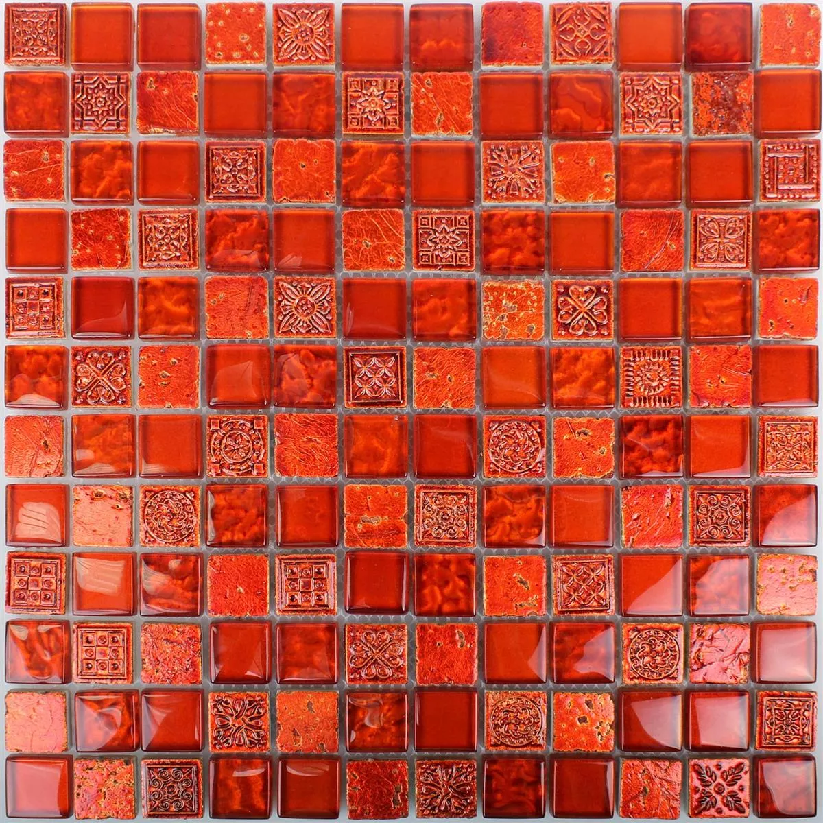 De moderne mosaikfliser Georgia Glas Naturstein Mix i rødt imponerer med deres specielle blanding af fliser i højkvalitets natursten og elegant glasmosaik. Stenstørrelsen er 23x23 mm med en tykkelse på 8 mm. En måtte har størrelsen 30x30cm. Med blandingen af materialer fra glasmosaik og naturstensfliser forvandler vægfliserne alle rum til en ekstraordinær og hyggelig atmosfære. Takket være materialeblandingen er overfladen på fliserne både mat og blank, så der kan sættes imponerende individuelle accenter.
