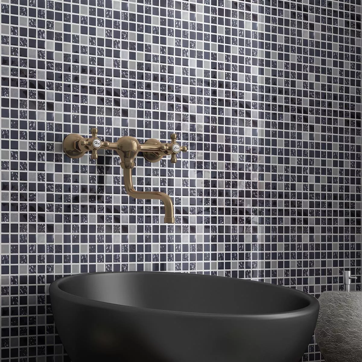 Blackriver mosaikflis i sort og sølv kombinerer glas og rustfrit stål for at skabe en elegant blanding af materialer. Denne glasmosaikflise er velegnet som både rustfri stålmosaik og vægflise, der tilbyder en stilfuld, blank og tumlet finish.