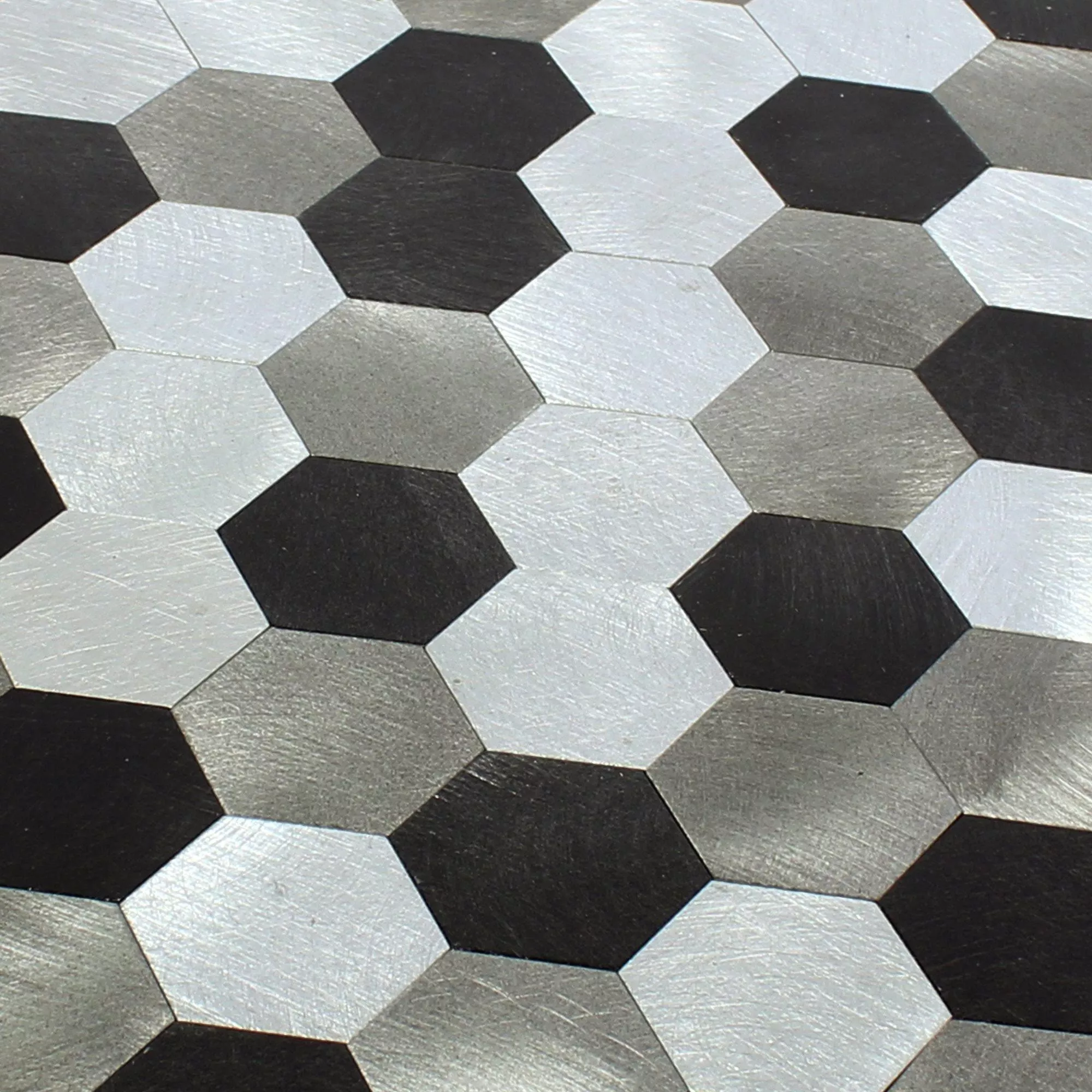 Denne fordel ved Tanana vægfliser muliggør lettere montering og sikrer et godt greb. Væg- eller mosaikfliserne er lavet af metal, mere præcist rustfrit stål. De er 4 mm tykke. Ydermere er overfladen på de sorte, grå og sølv vægfliser børstet. De selvklæbende Tanana mosaikfliser kan overbevise med det helt specielle og ret usædvanlige design, især med hensyn til den sekskantede form i kombination med de mere simple, elegante og moderne farver grå, sort og sølv. Fordi vægfliserne er et rigtigt blikfang og alligevel ikke for påtrængende i din personlige indretning, generelt meget stilfulde.