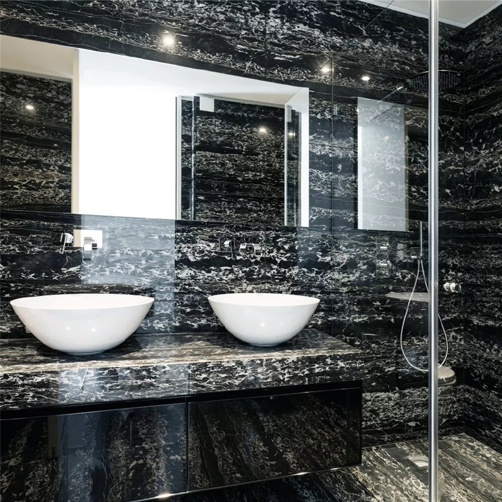 Med naturstensflisen Discovery Nero Galactica 60x60, som også er poleret, kan hvert badeværelse opfriskes visuelt. Selvom der bruges gulvvarme eller det bliver lidt koldere på badeværelset, kan disse gulvfliser med naturstenslook tåle de temperaturudsving. Naturstensfliser ser ud, når sort møder lys Den polerede finish af fine stentøjsfliser eller gulvfliser kommer først rigtig til sin ret, når der er tænkt på den rigtige belysning.