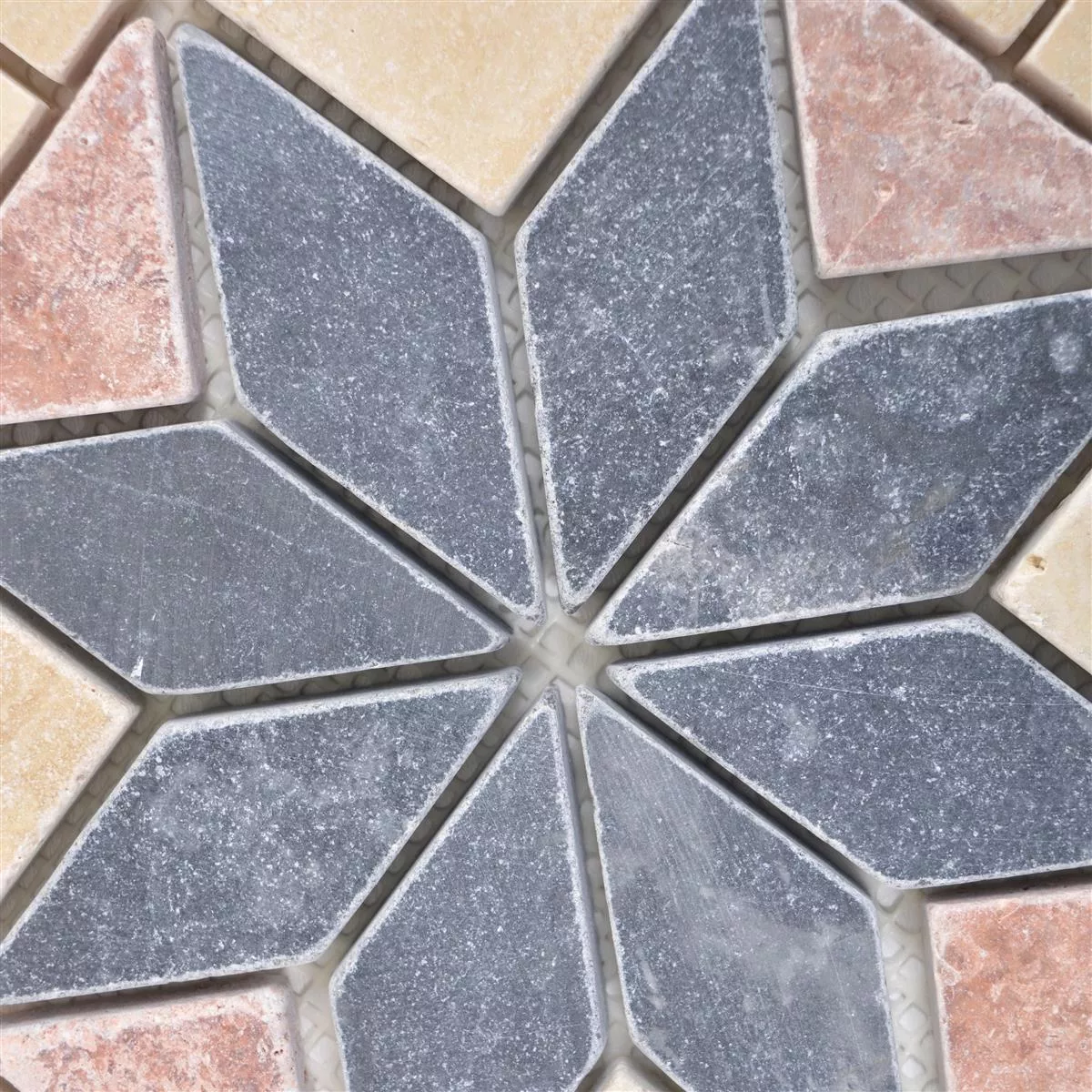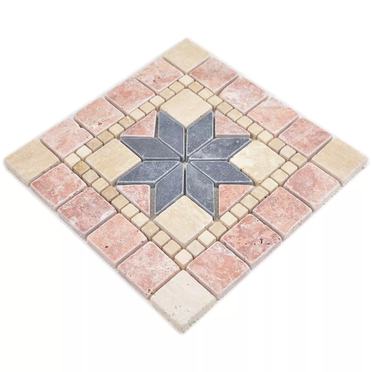 Naturstenfliserne Rosone Tarbora i Colormix Beige Red Black er en smuk iøjnefaldende. Blandingen af farver er meget slående, fliserne bogstaveligt talt skinner mod dig uden at virke for legende. Den beige og den sarte røde ser meget harmoniske ud. Den sorte vises i form af en mosaikblomst i midten af flisemåtten. Det er slående, men alligevel passende.