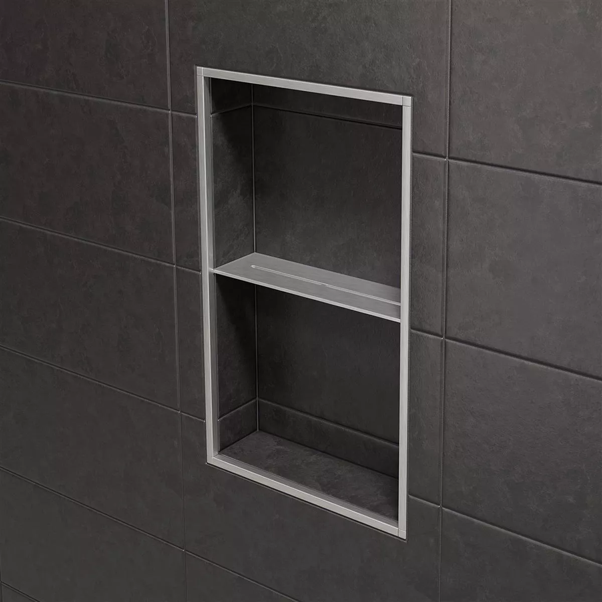 Schlüter-SHELF-N-S1 Grå Rektangulær Nichevæghylde. Med Schlüter-SHELF-N-S1 kan du udstyre den præfabrikerede Schlüter-KERDI-BOARD niche med en perfekt passende hylde under fliselægningen. Men det er ikke alt: Du har også maksimal fleksibilitet med hensyn til materiale og design. Denne nichevæghylde i høj kvalitet fås enten i børstet rustfrit stål eller tekstureret aluminium.