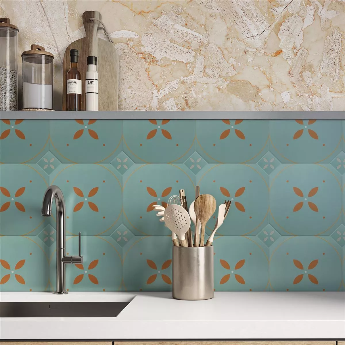 Die Feinsteinzeug Fliesen Genexia Decor Türkis bringen blumige Frische in Ihre Räume. Mit ihrer einzigartigen Blumenoptik und dem Retro-Design sind sie perfekt für Wand- und Bodenflächen in Küchen, Bädern, Duschen und Wohnräumen geeignet.