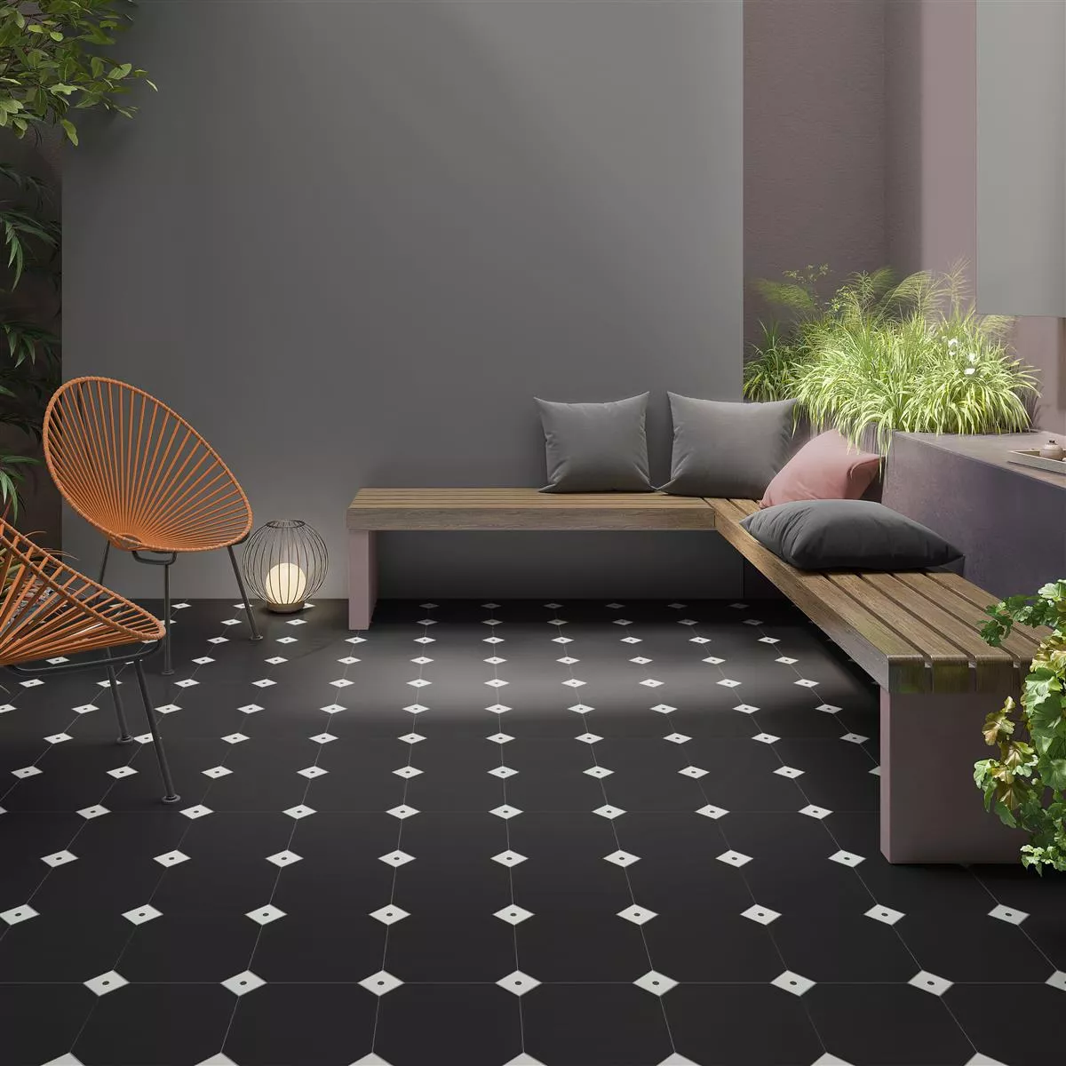 Giv dine værelser et klassisk og elegant touch med Genexia Uni Black Octagon 20x20cm porcelæns stentøjsfliser.