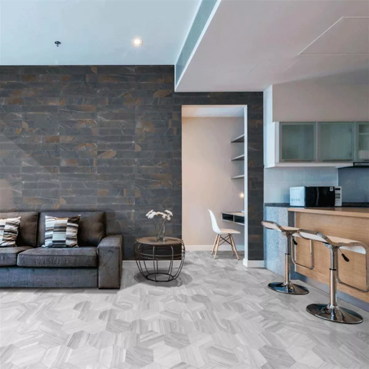 Giv dine rum et nyt look og skab en feel-good atmosfære med Hexwood Hexagon Grey porcelæns stentøjsfliser.