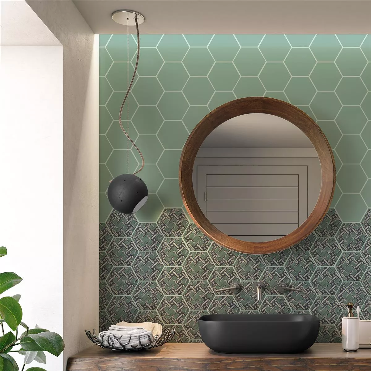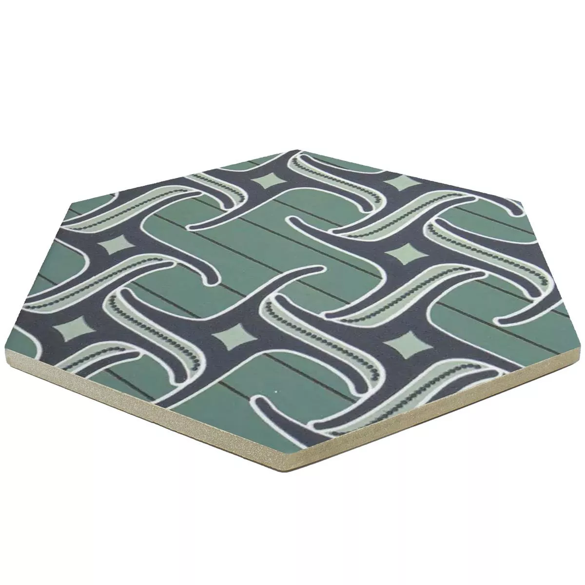 "Modena Hexagon Decor 4" porcelæns stentøjsfliser er et kunstværk til dit værelse. Med en tykkelse på 10 mm er de perfekte til våde områder, brusere, badeværelser, køkkener, stuer og indendørs områder. Den matte overflade og det dekorative motiv i blågrønt skaber en unik atmosfære.