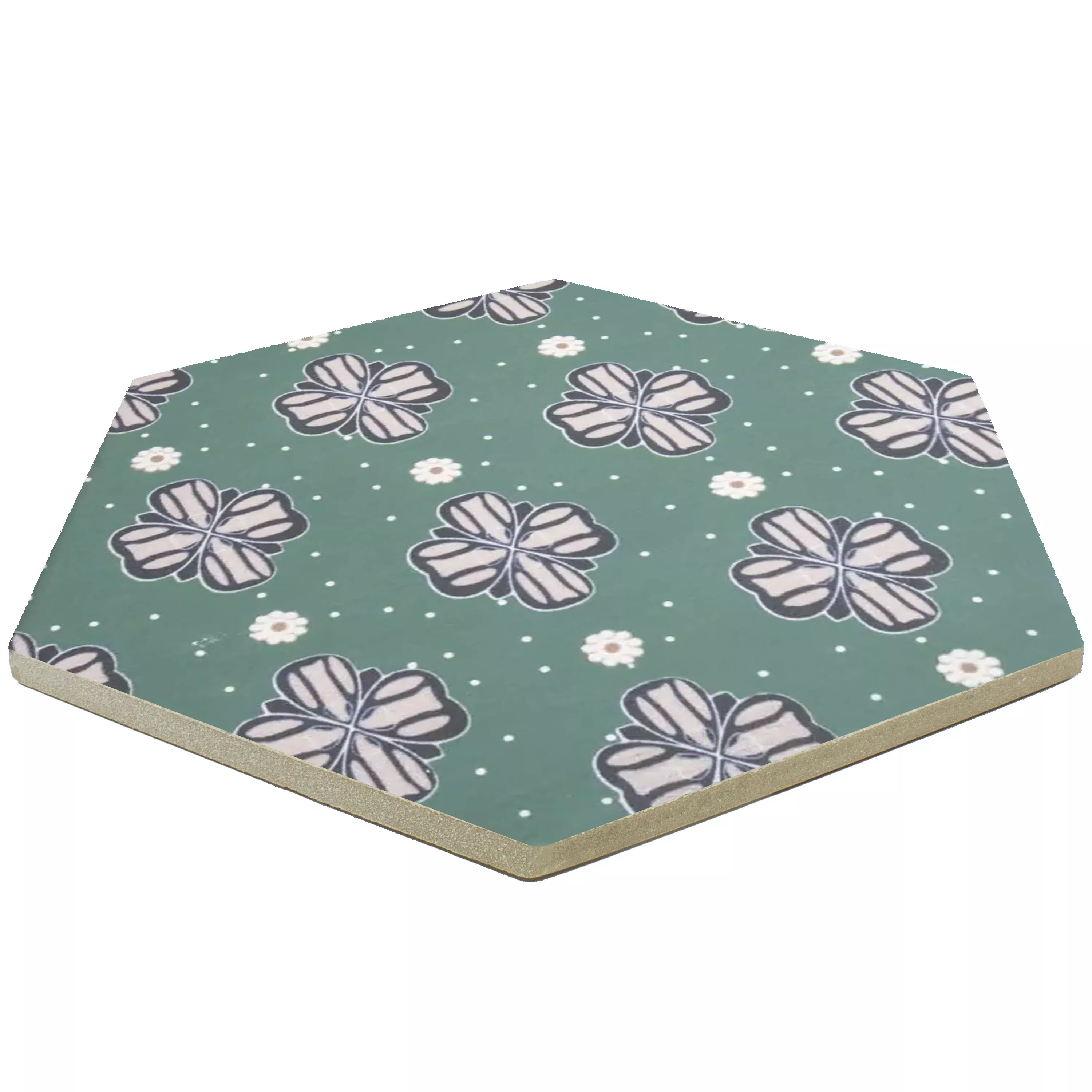 "Modena Hexagon Decor 7" porcelæns stentøjsfliser kombinerer imponerende design med høj funktionalitet. Med en tykkelse på 10 mm er de perfekte til våde områder, brusere, badeværelser, køkkener, stuer og indendørs områder. Den matte overflade, i en attraktiv grøn med blomsterdekorationer, giver fliserne et tidløst elegant udseende.