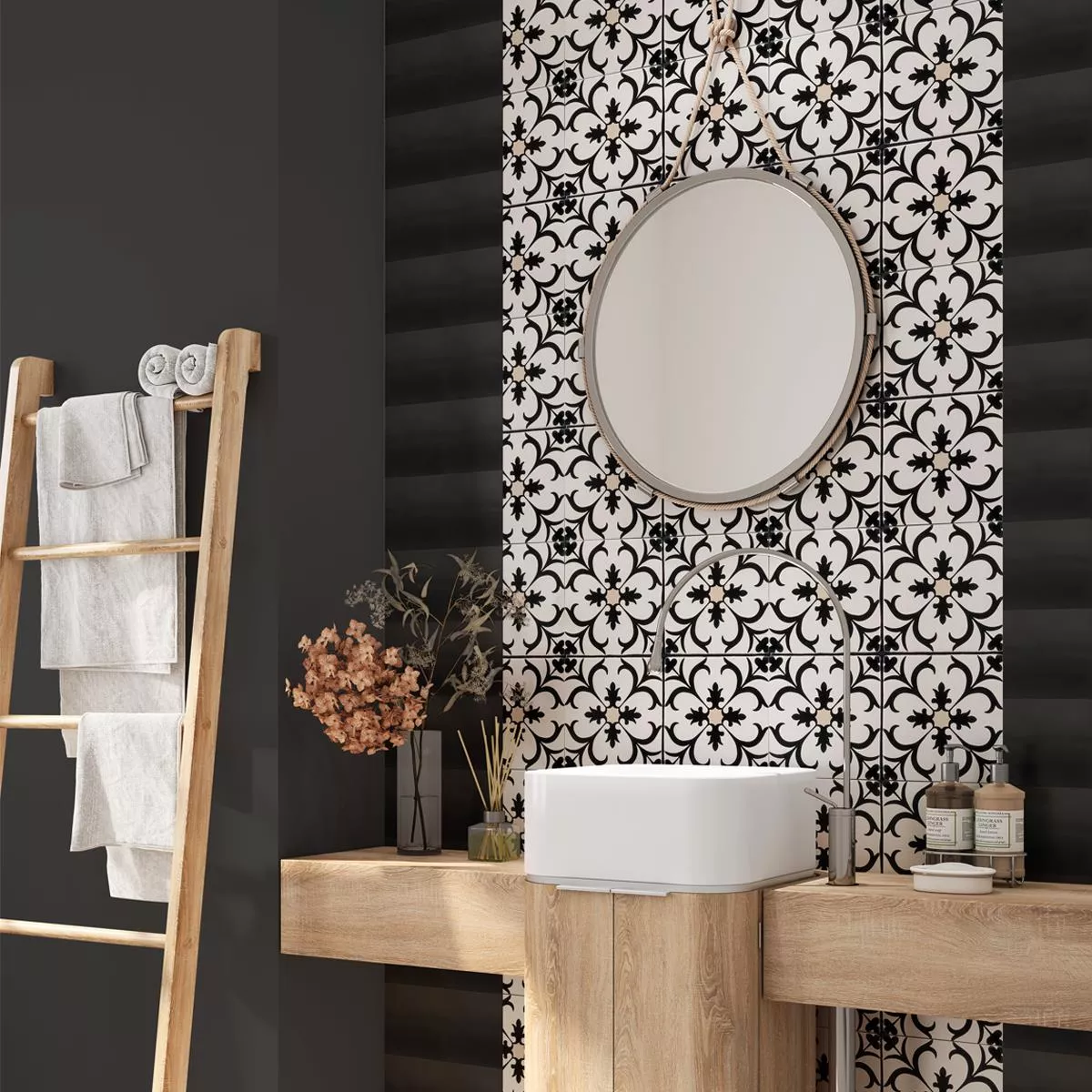 Bring den luksus og holdbarhed, du fortjener, ind i dit hjem med vores Ornamenti sorte porcelænsstentøjsfliser.