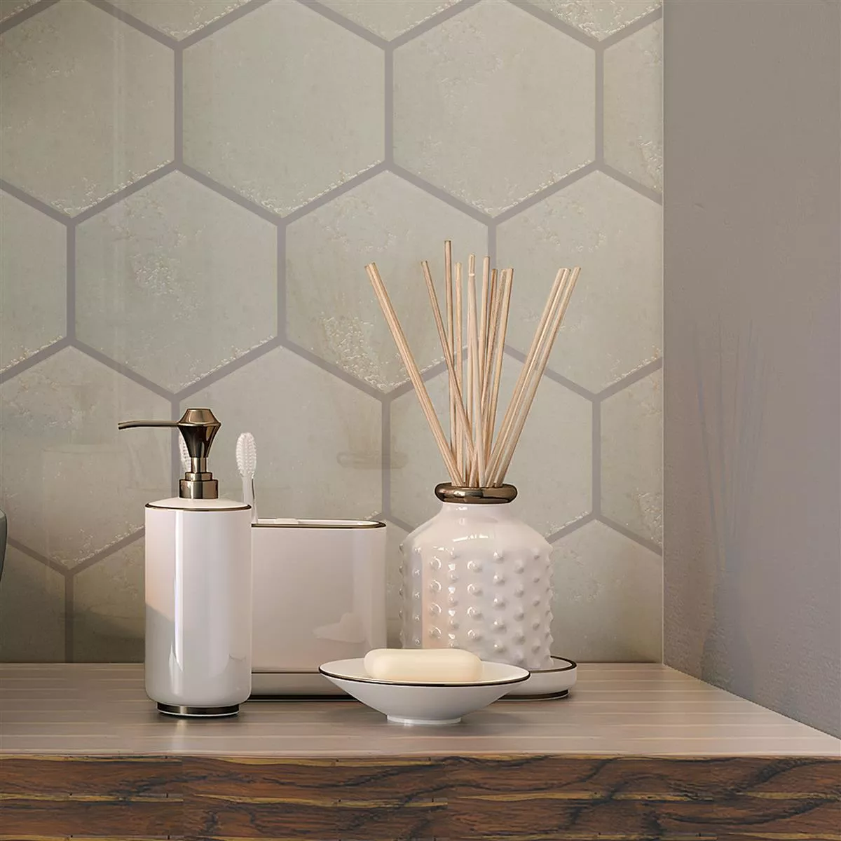 Med en tykkelse på 7 mm er flisen robust og er ideel til brug i forskellige områder af dit hjem - det være sig på badeværelset, bruseren, køkkenet eller stuen. Dens sekskantede format, der måler 13 x 15 cm, giver ethvert rum et moderne, geometrisk touch.