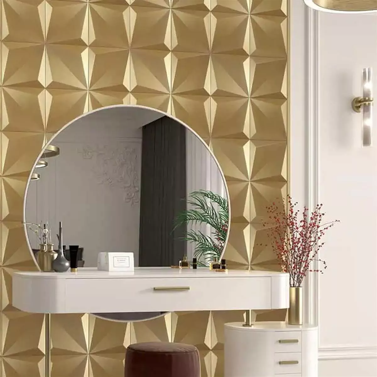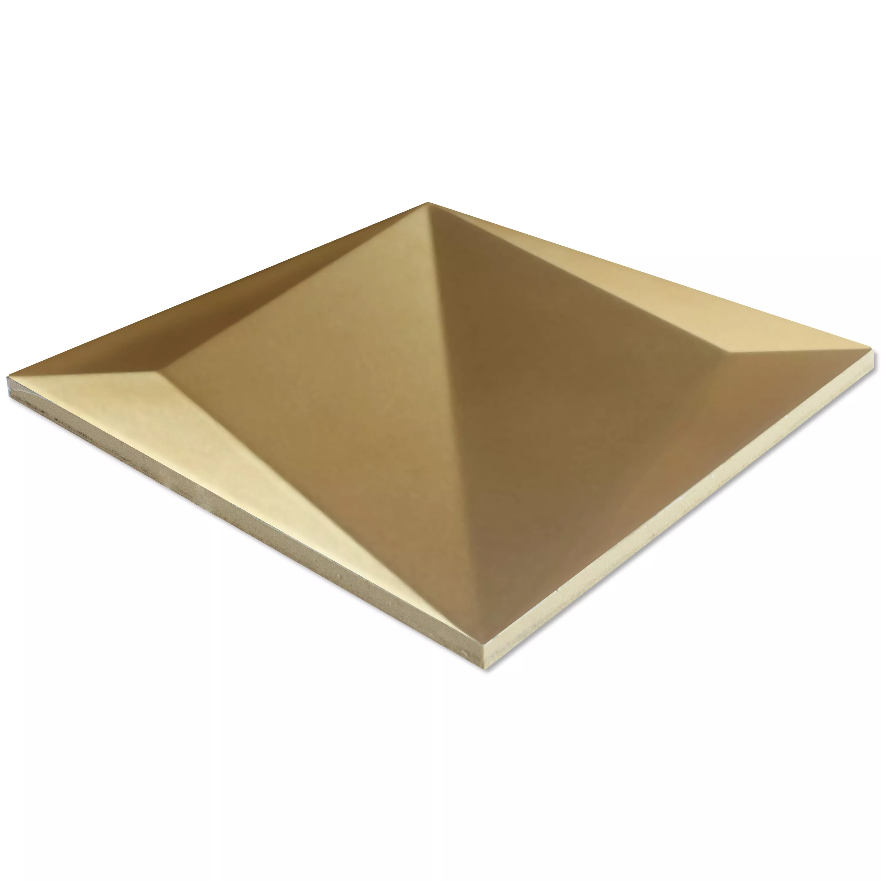 "Skyline 3D Origami Matt Gold" vægfliserne tilføjer en luksuriøs accent til dit hjem med deres unikke design. I en pakke på 0,50m² tilbyder disse firkantede fliser (25x25cm) en glaseret, mat overflade i strålende guld. 3D origami-designet giver din