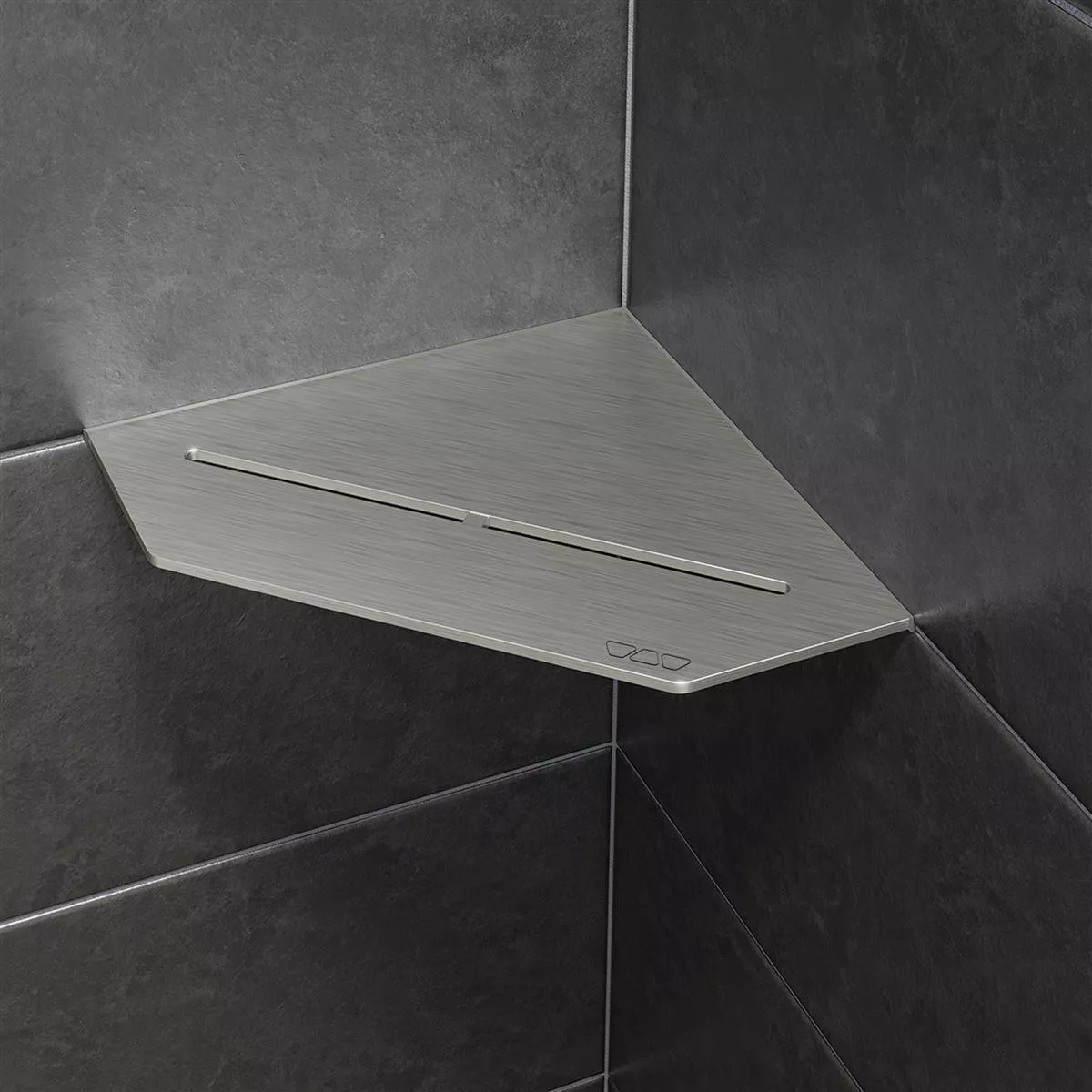 Schlüter-SHELF-E er hylder i tre forskellige geometrier til hjørnemontering. Hylderne kan sættes direkte ind i flisevæggenes samlinger ved fliselægning eller efterfølgende ved brug af støttevingerne, som kun er 2 mm tykke.