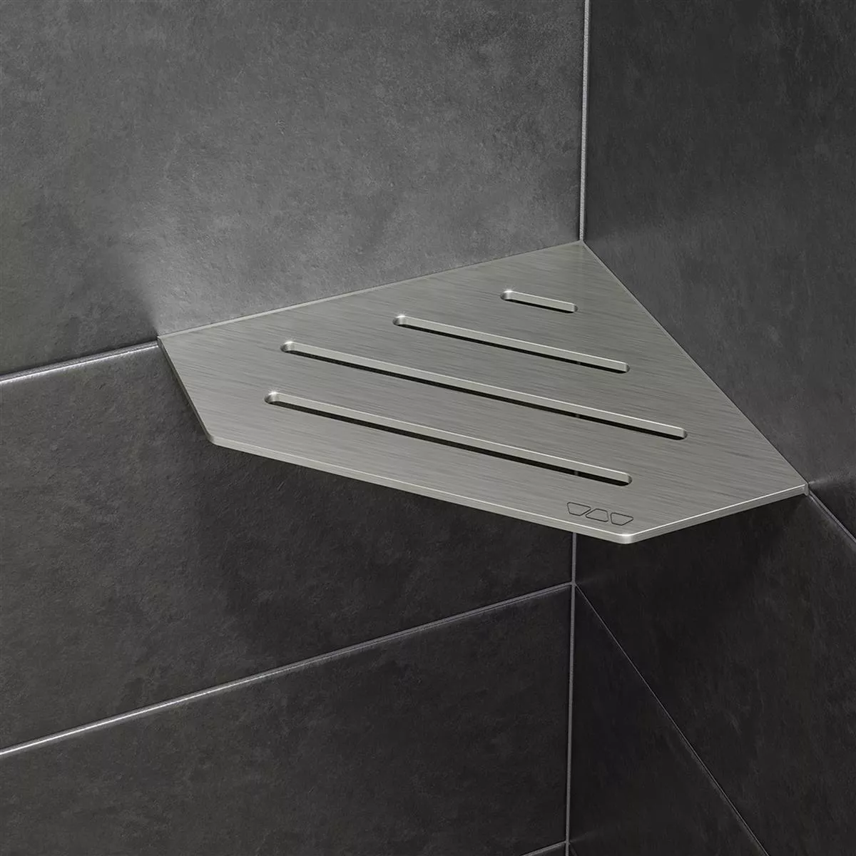 Schlüter-SHELF-E er hylder i tre forskellige geometrier til hjørnemontering. Hylderne kan indsættes i flisevægges samlinger direkte ved fliselægning eller efterfølgende ved brug af støttevingerne, som kun er 2 mm tykke.