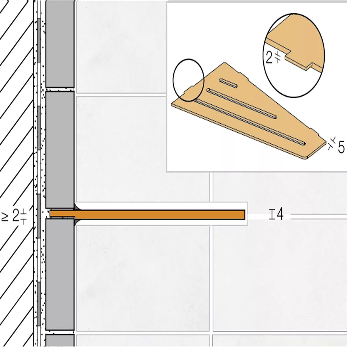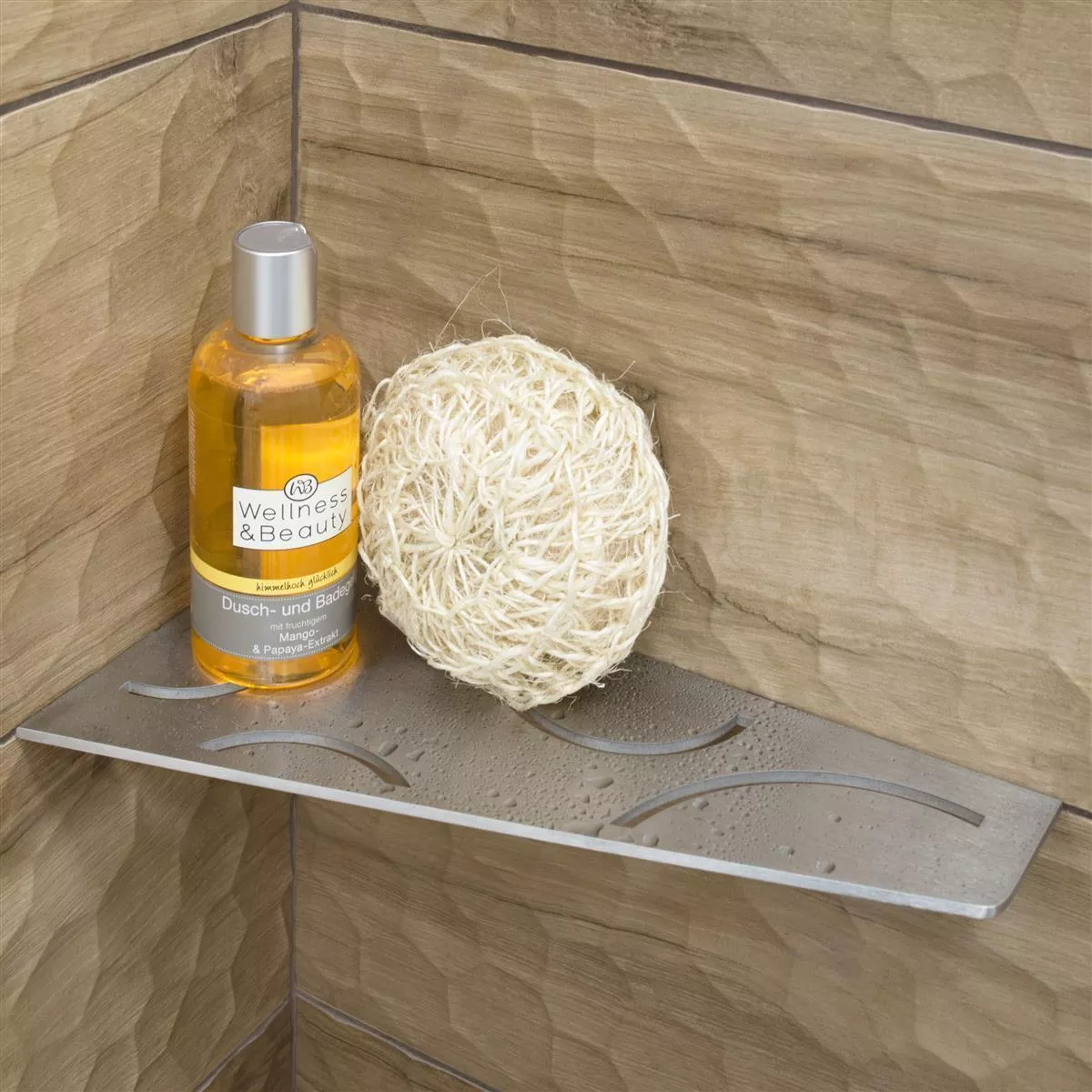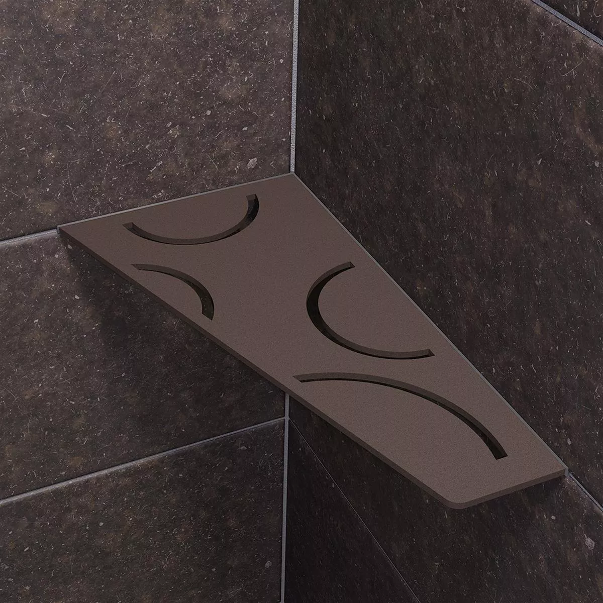 Schlüter-SHELF-E er hylder i tre forskellige geometrier til hjørnemontering. Hylderne kan indsættes i flisevægges samlinger direkte ved fliselægning eller efterfølgende ved brug af støttevingerne, som kun er 2 mm tykke.