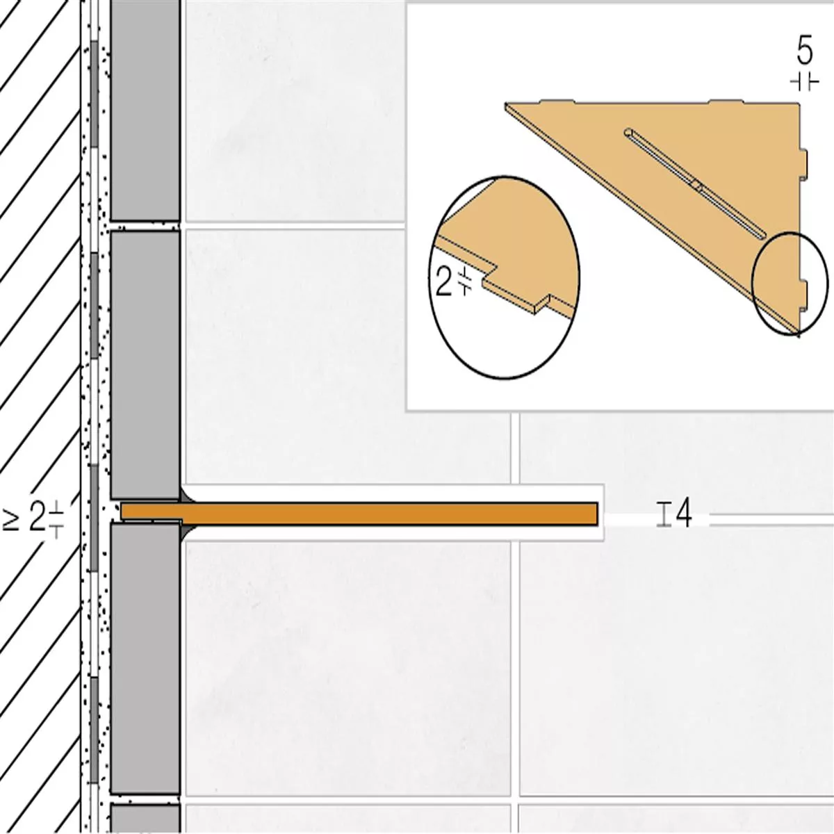 Schlüter-SHELF-E er hylder i tre forskellige geometrier til hjørnemontering. Hylderne kan indsættes i flisevægges samlinger direkte ved fliselægning eller efterfølgende ved brug af støttevingerne, som kun er 2 mm tykke.